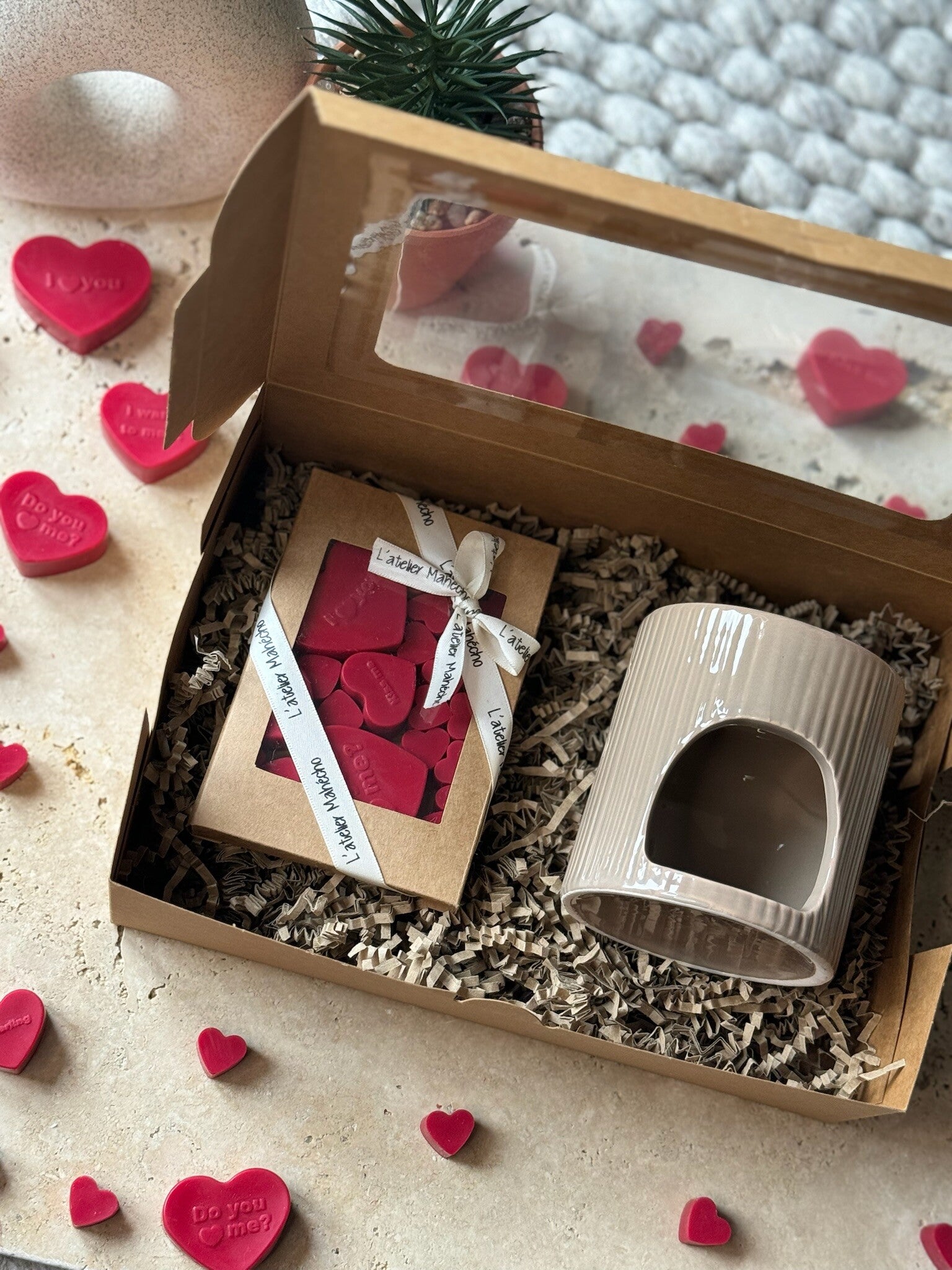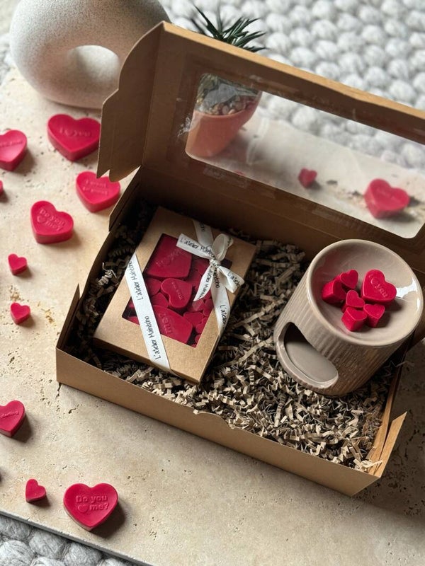 Nos coffrets sont le cadeau idéal pour la Saint-Valentin, le modèle Jade se compose d'une boîte de fondants parfumés (parfum & couleurs à choisir dans les variantes) ainsi qu'un brûleur pour les diffuser.